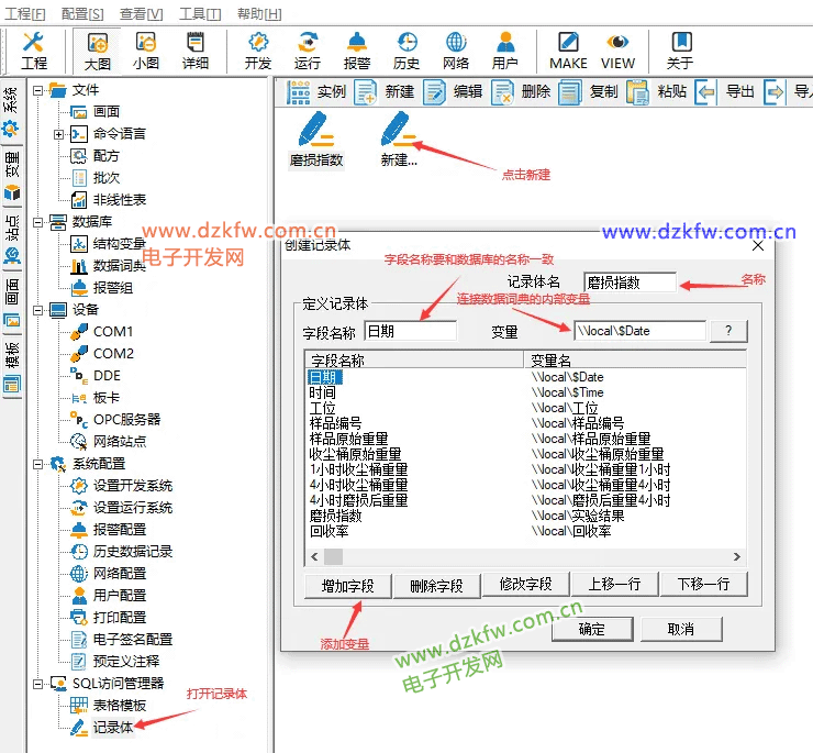 打开组态王,创建记录体,字段名称要和数据库的名称相同,内部变量的类型要和数据库中变量类型一致。