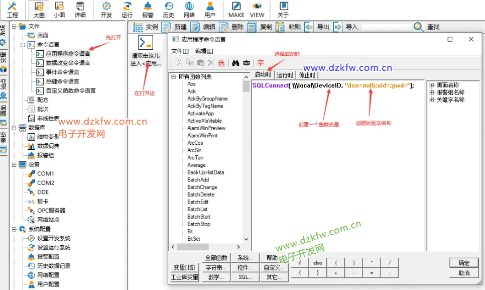在命令语言中进行设置,运行时写SQLConnect( \\local\DeviceID, “dsn=mdb;uid=;pwd=”); 。停止时写SQLDisconnect(\local\DeviceID); 。这样运行就可以连接上数据库了。