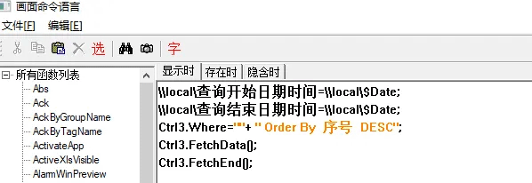 Ctrl3.Where=“样品编号=’”+\local\查询样品编号+"’"+ " Order By 序号 DESC";