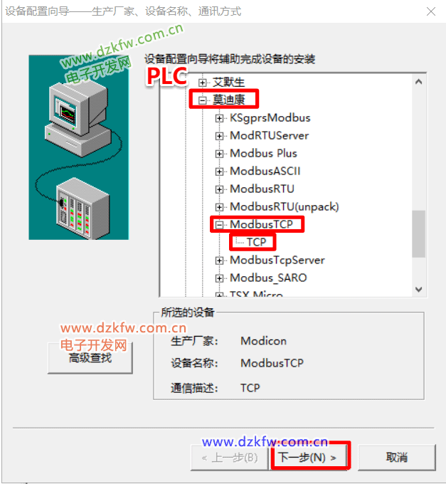5、选择PLC->莫迪康->ModbusTCP->TCP