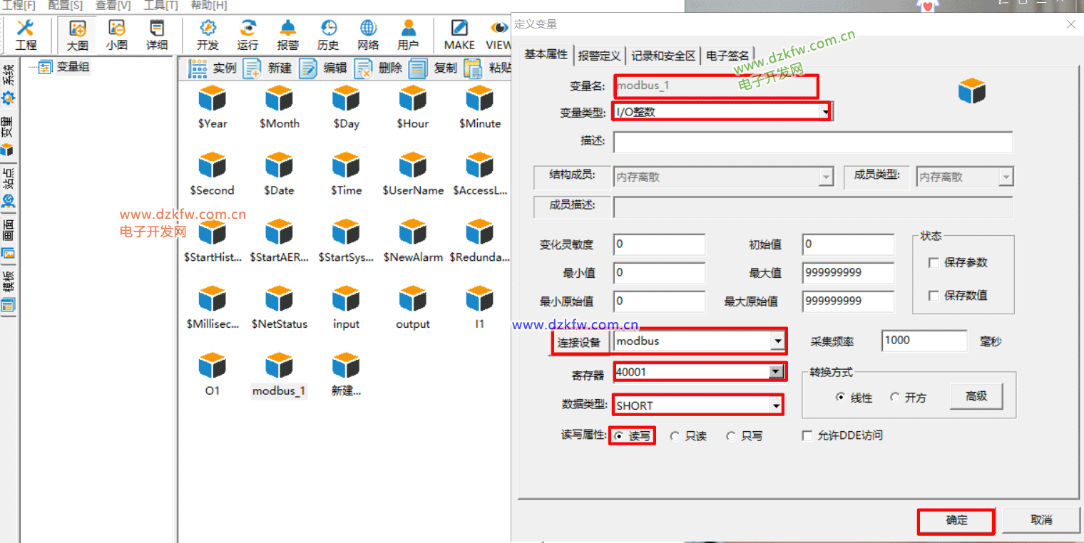 9、新建一个变量,这个新建了一个modbus_1的变量,类型为 I/O整数,连接到刚才建立的设备,寄存器设置为要读取或写入的地址,类型为SHORT
