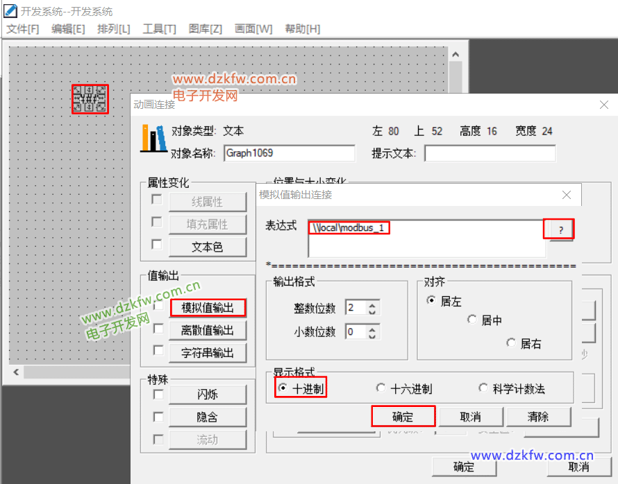 双击字符串,选择模拟值输出,通过?,选择刚才定义的变量,选择十进制,然后确定