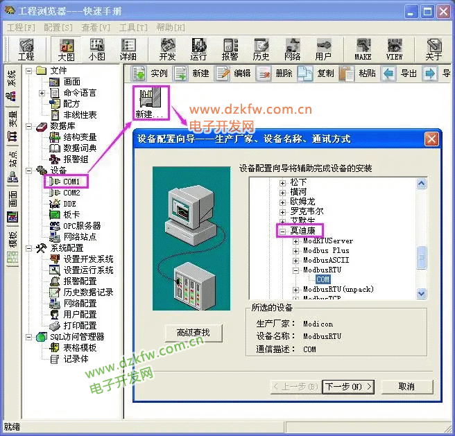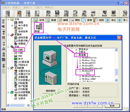 选择工程浏览器左侧大纲项“设备\COM1”,在工程浏览器右侧用鼠标左键双击“新建”图标,运行“设备配置向导”,选择:[PLC] > [莫迪康] > [ModbusTCP] > [TCP]如下图所示: