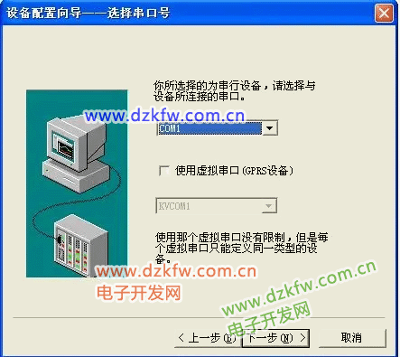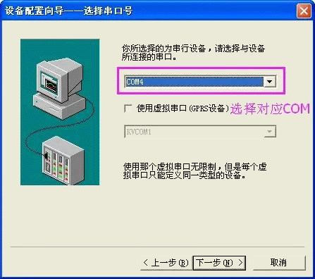 为设备选择连接串口,选择 COM4,根据实际对应 COM 进行选择,单击“下一步”,弹出“设备配置向导”,如下图 所示。