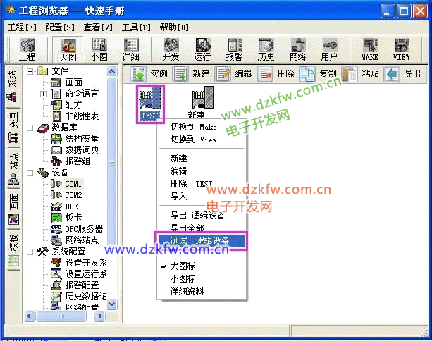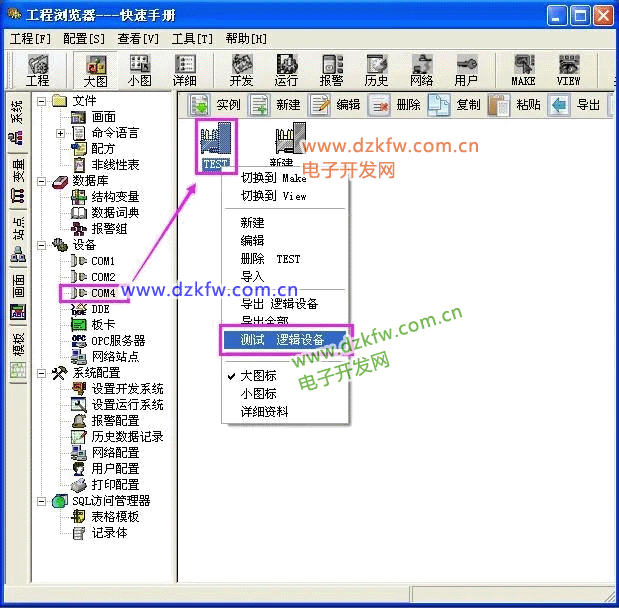 选择[COM4] > [TEST]>[测试 逻辑设备],如下图所示: