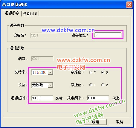 选择“通讯参数”选项,将通讯参数设置为“115200、N、8、1”。通讯超时和采集频率选择默认即可。选择“设备测试”项,界面如下图所示:
