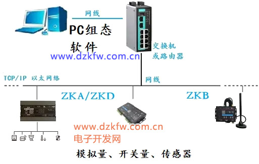 以 ZKA-4488-ETH为例说明 DI\DO\AI\AO 如何接入组态王使用,ZKA-4488-ETH 为 8路数字量输入(DI)和 8 路数字量输出(DO)和4路模拟量输入(AI)采集以及4路模拟量输出(AO)输出控制设备,采用标准的 Modbus TCP 通讯协议,可以通过 TCP/IP 网络远程采集模拟量数据。