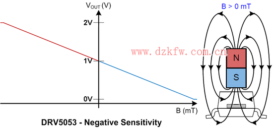 德州仪器 (TI) 的 DRV5053 模拟霍尔 IC 有 3 个引脚:电源、接地和输出。在没有外部磁场时,输出可驱动 1V 电压。在磁场线从封装底部穿到顶部时,输出会根据磁通量密度的垂直组件线性降低至 0V。这相当于将一个南磁极带到了器件顶部附近。