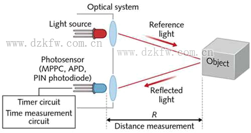 在ToF LiDAR中,激光发出持续时间为τ的光脉冲,在发射的瞬间激活计时电路内部时钟(见图2)。从目标反射的光脉冲到达光电探测器时,会产生一种使时钟失效的输出电信号。这种电子测量往返ToF Δt 可计算出目标到反射点的距离R。