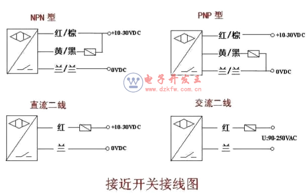 1)接近开关有两线制和三线制之区别,三线制接近开关又分为NPN型和PNP型,它们的接线是不同的。请见下图所示: