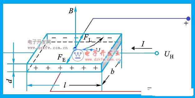 我们以半导体霍尔元件为例来说明它的工作过程。在下图中我们给半导体霍尔元件通入电流I,然后把这个半导体薄片放在以磁场强度为B的磁场中,这时半导体内的电子将受到一种磁力(洛仑兹力)F的作用就会向内侧移动,因此在内侧就堆积了很多电子,随着电子堆积的越来越多,此时就会形成一种电场。当电子既受到磁场力的作用,又受到电场力的作用,如果此时两种力达到了一种平衡时,那么电子的堆积也就达到了一种动态平衡,这时候就建立起一种电压,我们把这种电压叫霍尔电动势,一般用Eh表示,那么霍尔电动势Eh可用Eh=KIB来表示。从这个式子可以看到,这个K是霍尔元件的灵敏度,这个I和B分别表示通入的电流和所在的磁场强度,因此我们知道,在通入电流一定的情况下,磁场强度越强,那么所感应的霍尔电动势就越大。
