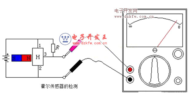 我们知道霍尔传感器在有磁场靠近时就会从输出端输出一个电压信号,因此我们可以测量输出端的电压变化来判断霍尔传感器是不是正常。我们知道在集成的霍尔传感器中,它通常为集电极开路输出型的,因此我们在检测它的质量好坏时要加一个限流电阻。在正常时,霍尔传感器输出端“3”脚应为高电平,一般会接近电源电压Vcc。当我们用一个小磁铁靠近霍尔传感器印有数字的一面时,如果此时万用表指示的电压降到0.6V以下的话,说明霍尔传感器是好的。如果当小磁铁已接触到霍尔传感器印有数字的一面时,万用表指示的电压仍不下降,然后把磁铁的磁极调换一下再试,如果这时万用表指示下降为0.6V以下的话,也说明霍尔传感器是好的,如果正反时,万用表电压都不下降,这就说明霍尔传感器已经损坏不能用了,其测试方法如下图所示。