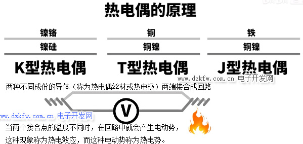 当两个接合点的温度不同时,在回路中就会产生电动势,这种现象称为热电效应,而这种电动势称为热电势。热电偶就是利用这种原理进行温度测量的,其中,直接用作测量介质温度的一端叫做工作端(也称为测量端),另一端叫做冷端(也称为补偿端);冷端与显示仪表或配套仪表连接,显示仪表会指出热电偶所产生的热电势。