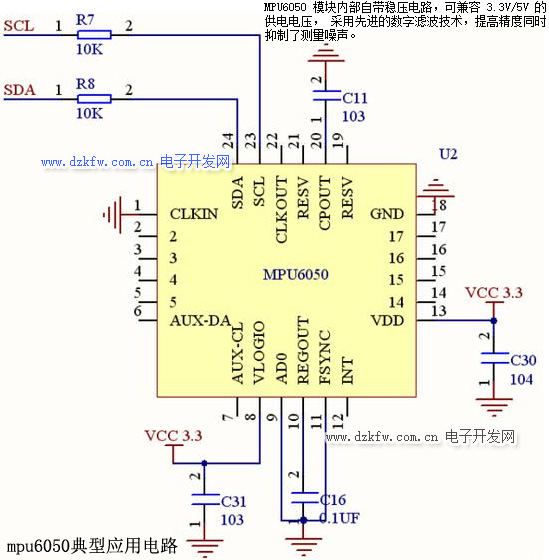MPU-60X0 对陀螺仪和加速度计分别用了三个 16 位的 ADC,将其测量的模拟量转化 为可输出的数字量。为了精确跟踪快速和慢速的运动,传感器的测量范围都是用户可控的, 陀螺仪可测范围为±250,±500,±1000,±2000°/秒(dps),加速度计可测范围为±2,±4, ±8,±16g。 一个片上 1024 字节的 FIFO,有助于降低系统功耗。 和所有设备寄存器之间的通信采用 400kHz 的 I2C 接口或 1MHz 的 SPI 接口(SPI 仅 MPU-6000 可用)。对于需要高速传输的应用,对寄存器的读取和中断可用 20MHz 的 SPI。 另外,片上还内嵌了一个温度传感器和在工作环境下仅有±1%变动的振荡器。 芯片尺寸 4×4×0.9mm,采用 QFN 封装(无引线方形封装),可承受最大 10000g 的冲 击,并有可编程的低通滤波器。 关于电源,MPU-60X0 可支持 VDD 范围 2.5V±5%,3.0V±5%,或 3.3V±5%。另外 MPU-6050 还有一个 VLOGIC 引脚,用来为 I2C 输出提供逻辑电平。VLOGIC 电压可取 1.8±5%或者 VDD。