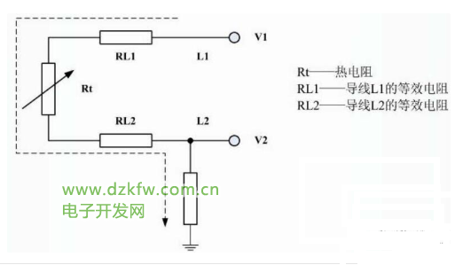 如下图。变送器通过导线L1、L2给热电阻施加激励电流I,测得电势V1、V2。