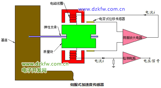 当被测振动物体通过加速度计壳体有加速度输入时,质量块偏离静平衡位置,位移传感器检测出位移信号,经伺服放大器放大后输出电流,该电流流过电磁线圈,从而在永久磁铁的磁场中产生电磁恢复力,迫使质量块回到原来的静平衡位置,即加速度计工作在闭环状态,传感器输出与加速度计成一定比例的模拟信号,它与加速度值成正比关系。