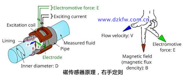 电磁流量计的操作基于法拉第定律,该定律指出,当导电流体通过磁场时,它们会产生与流速成比例的电动势。根据弗莱明的右手定则,电动势是在垂直于流体运动和磁场方向的方向上产生的。