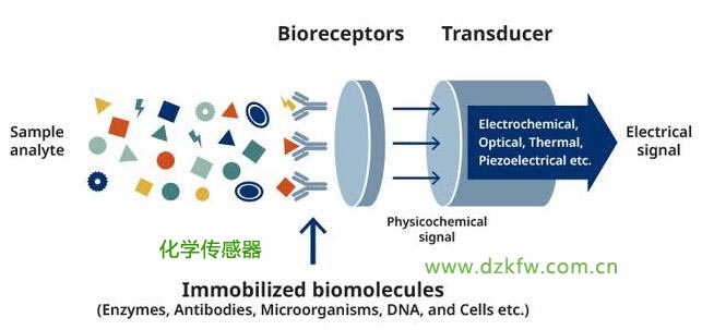 生物传感器利用发出电和光信号的生物特性检测状态或物质。它们被认为是化学传感器的一部分,并利用电化学方法来检测由于酶和抗体的作用而发生变化的化学物质的浓度和组成。这些酶,抗体,微生物,DNA和细胞被用作传感器的一部分,并且通过结合源自活生物体的功能,生物传感器提供了可以在被测分子水平上鉴定的高选择性。