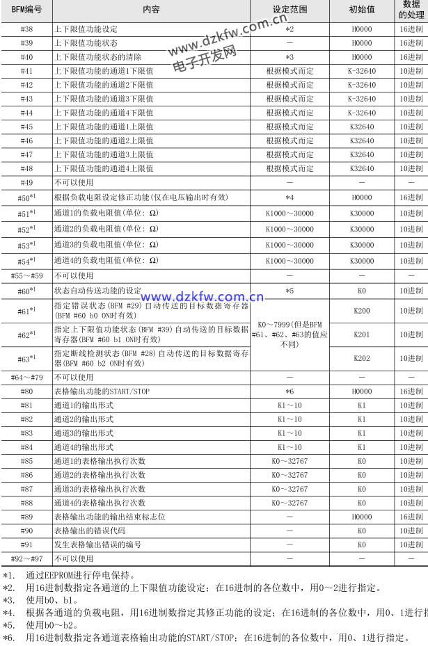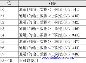 BFM#38为上下限值功能的设定,用HOOOO表示各通道的设置。O为0时,功能无效,O为1时功能有效输出不限制,O为2时功能有效输出有限制。BFM#1~4输出数据值与BFM#41~44设定的下限值和BFM#45~48设定的上限值比较,超出限值时,BFM#39上下限功能状态相应的位置会置1。