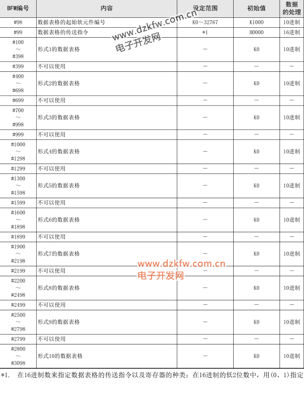 BFM#6为输出状态。如PLC为停止状态以及改变BFM#0、5、9、19、20、32~35、50、51~54、60~63、99的设定时输出状态为H0000,输出BFM#5设定的数据。