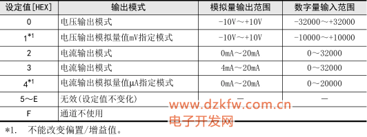 FX3U-4DA 模拟量输出模块的缓冲存储器BFM#0是存储输出模式的设定值,用十六进制数HEX码表示。如H3300表示第一通道、第二通道为电压输出模式;第三通道、第四通道为电流输出模式。