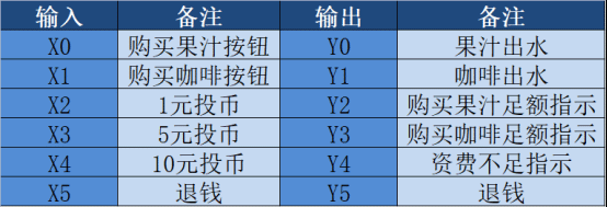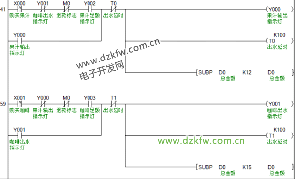 有两个按钮分别购买果汁和咖啡;当金额足够时,可购买果汁,总金额需减去K12,购买咖啡时,总金额需减去K15;两种饮品只能先出一种饮品再出另外一种,不能同时出,所以Y0和Y1需互锁;退款时按下购买果汁和咖啡按钮无效。