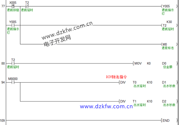 按下退钱按钮,退款标志M0线圈得电且退钱指示灯点亮,退款计时3S后总金额清0。