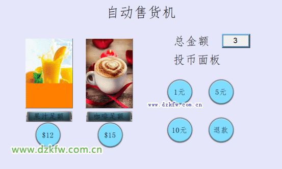 (1)币值可分为1元、5元、10元,果汁单价为12元,咖啡单价为15元。投币时,要求
