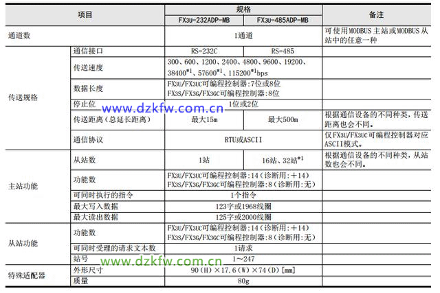 MODBUS通信根据与可编程控制器连接的特殊适配器(FX3U-232ADP-MB或FX3U-485ADP-MB)的下列规格执行