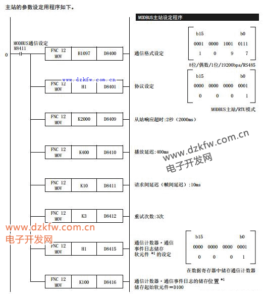 4.因此推荐只使用1次“LD M8411”。4. MODBUS通信设定的语法请全部用MOV指令和常数(K或H)设定MODBUS通信参数。如果在通信设定中使用非常数或间接指定,则MODBUS通信参数会变得无效,MODBUS通信也会无效。