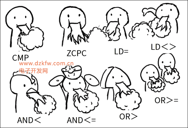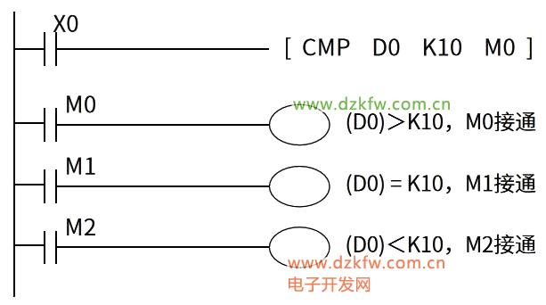 如执行指令CMP D0 K10 M0表示:将数据寄存器D0中的内容与常数K10进行比较,若D0的内容(D0)>K10,M0接通;若D0的内容(D0)=K10,M1接通,若D0的内容(D0)<K10,M2接通。