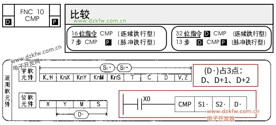 CMP指令是所有比较指令中最为常用的指令,也是功能指令中的常用指令之一,其在编程手册中的说明如下图所示。