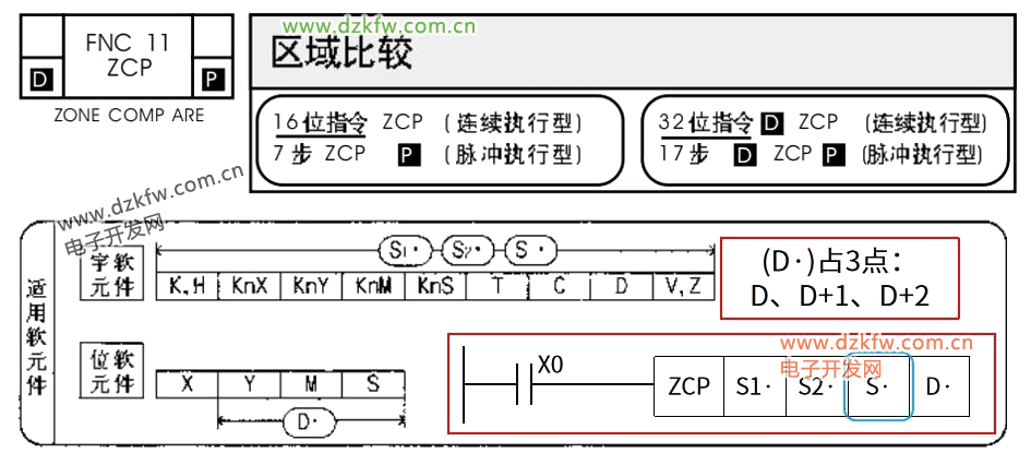 ZCP指令是区间比较指令,所谓区间,就是一个数据范围。例如我们考试,将成绩划分为3个区间:0-59分为不及格,60-80分为良好,81-100分为优秀。ZCP指令也将数据划分为3个区间,分界点分别为S1、S2,而S就是被用于比较的主角,例如我们每个人所考的成绩。终址D的含义类似于CMP指令中的D,也是用于反馈比较结果,占用3点:D、D+1、D+2。