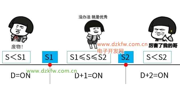类似于CMP指令,在ZCP指令中,当驱动条件成立时,将源址S数据分别与源址S1、S2数据进行比较,若比较结果S<S1,则D接通;若S1≤S≤S2,则D+1接通;若S>S2,则D+2接通。