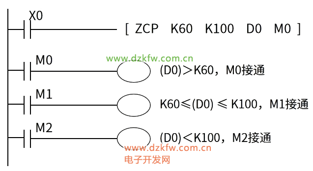例如执行指令ZCP K60 D0 K100 M0表示:若数据寄存器D0的内容(D0)<K60,则M0接通,若K60≤(D0)≤K100,则M1接通;若(D0)>K100,则M2接通。