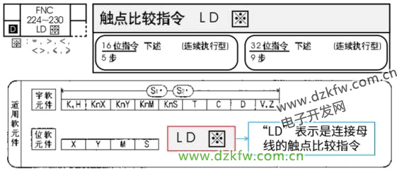 所谓“起始”,是指这指令与母线相连接,以“LD”开头,其用法类似于“LD(取)”指令。起始触点比较指令一共有6个,如下图所示。