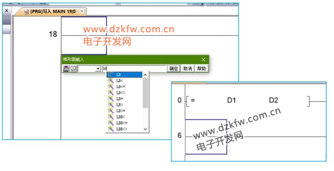 从上图可见,起始触点比较指令有6个是因为两个源址S1、S2的比较结果可以分为6种情况。其中S1≠S2不能直接输入“≠”符号,而是输入“<>”,同样的,大于等于符号“≥”应用“>=”符号表示,小于等于符号“≤”应用“<=”符号表示。
