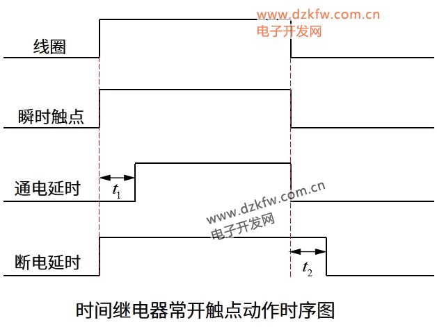 根据变化的不同,时间继电器有三种类型触点:瞬时动作、通电延时、断电延时。结合时间继电器常开触点动作时序图,我们可以更为直观的看出其触点的动作过程,特别是“通电延时”和“断电延时”。