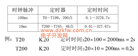 从上图我们也可以看出,定时器的时钟脉冲是由它们的编号区分的,其中T0~T199为时钟脉冲100ms的定时器,共200个;T200~T245为时钟脉冲10ms的定时器,共46个。例如选用T20这个定时器,那就表示选用了时钟脉冲为100ms的定时器,K20表示十进制数的20,所以T20 K20就表示定时器的定时时间为20个脉冲,即20×100=2s。