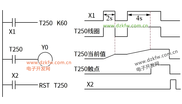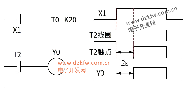 因为PLC的定时器类似于继电控制电路的时间继电器,所以,在梯形图中,我们把定时器作为线圈处理,如上图所示,定时器的驱动元件为X1触点,当X1触点闭合,定时器T20(线圈)得电,经过定时时间2s后,定时器的常开触点闭合。