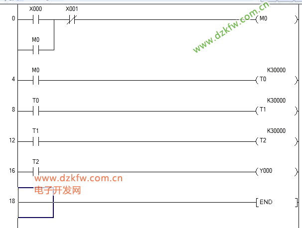 每一个定时器的定时时间是有限制的,那么,如果我们需要的定时时间超过定时器的最长定时时间,怎么办呢?简单,一个不够,两个来凑。如下图所示,一个定时器最多可以累计32767个时钟脉冲,为了好看,我们就取3万个吧,然后把几个定时器进行接力。这时候,从X0闭合到线圈Y0得电,此间的定时时长就为30000×3×100ms=150min,也就是两个半小时,这也太久了吧。