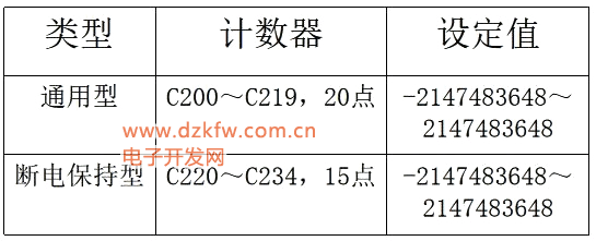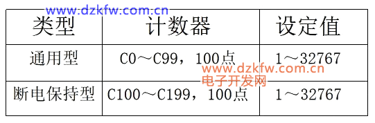 和定时器一样,计数器的设定值除了可以用十进制数K来表示外,也可以用数据寄存器D的内容来表示,不过这里要注意的是,16位加计数器的设定值用一个D就可以寄存,而32位加/减计数器就需要两个相邻的D才行,如D0、D1,且D1为高位,D0为低位。因为D也是16位的,要寄存32位的数,也只能用两个D。