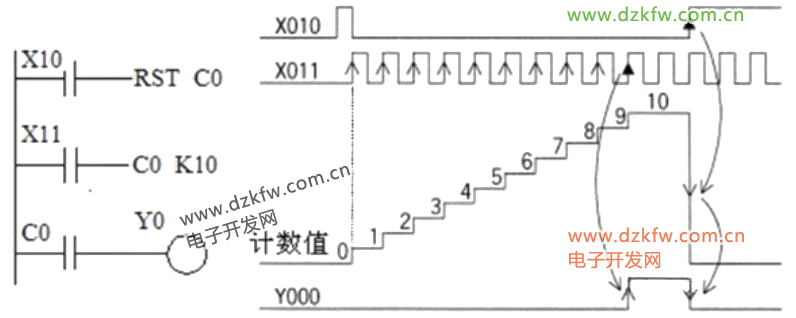 如上图所示,C0计数器的设定值是K10,也就是说触点X11通断10次,计数器的触点才会动作。类似于定时器,当PLC断电,通用计数器会自动复位,但和定时器不同的是,定时器的驱动信号断开,定时器也会复位,但计数器前的触点断开,如上图的X11,计时器会进行计数,而不是复位。
