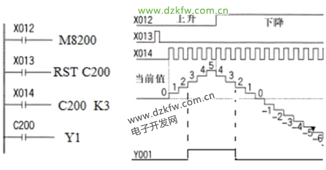 当M8200断开(为OFF)时,C200作加法计数,当M8200接通(为ON)时,C200作减法计数。类似于开车,M8200就像是倒车挡,一旦挂倒挡,踩了油门,车子就后退,退出倒车挡,车子就恢复为前进。