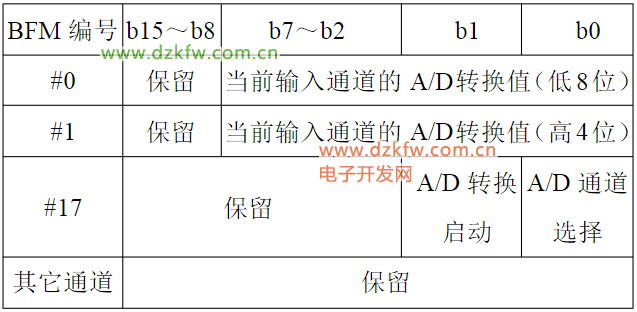 转换结果数据在模块缓冲存储器(BFM)中的存储地址如下,BFM是16位的: