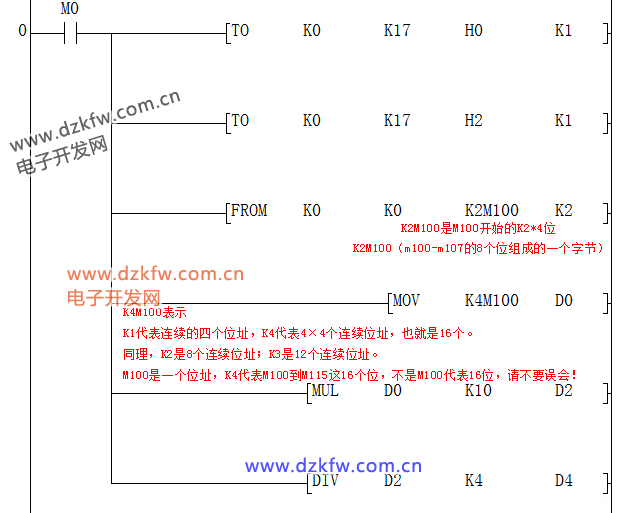 1. K4M100,该操作将M100-M115的数据内容转移到数据储存器D0中(通道1的高端4位移动到下面的8位位置上,并存储到D0);