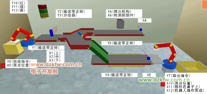 5、当操作面板上的[SW2](X25)被置为ON以后,当机器人开始搬运一个中部件。当一个小部件被放到碟子上,或者一个大部件从传送带的右端掉下。一个新部件会被自动补给。