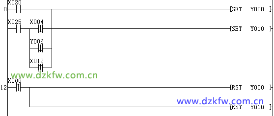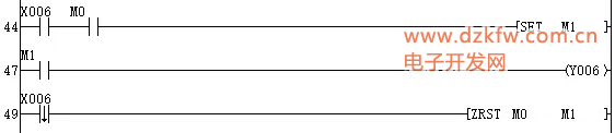 当小物品传送到后传送带的感应器(X006)置位M1,通过M1控制停止后传送带(Y005)。当小物品被完全推出后传送带,用X006下降沿控制复位M0和M1。表示小物品已不在后传送带且后传送带继续运行。如图图3-3-4。