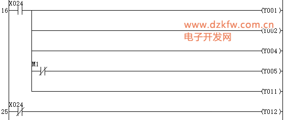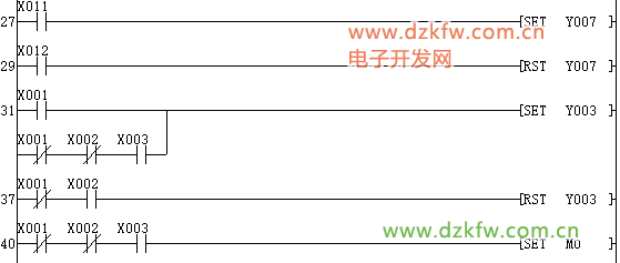 当中物品传送到部件桌子上感应器(X011)感应到,X011常开触点控制机械手抓取(Y007)。当机械手完成抓取(X12)复位(Y007)。