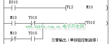 交替输出电路其实就是单按钮控制启停功能,交替输出有N多种编程方法,这里仅以其中一种为例。
